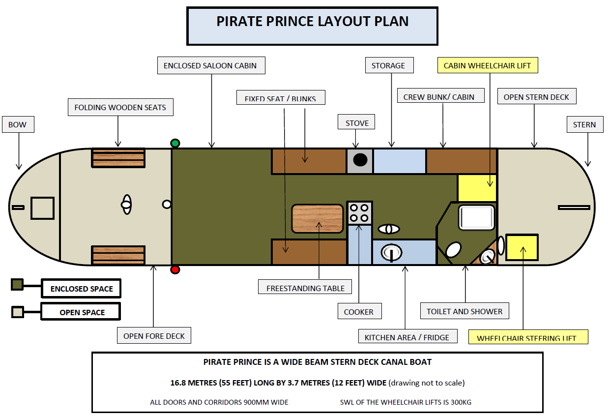 Our fully-accessible, wide beam canal boat - Pirate Prince is available for day trips on the canal or longer residential excursions.